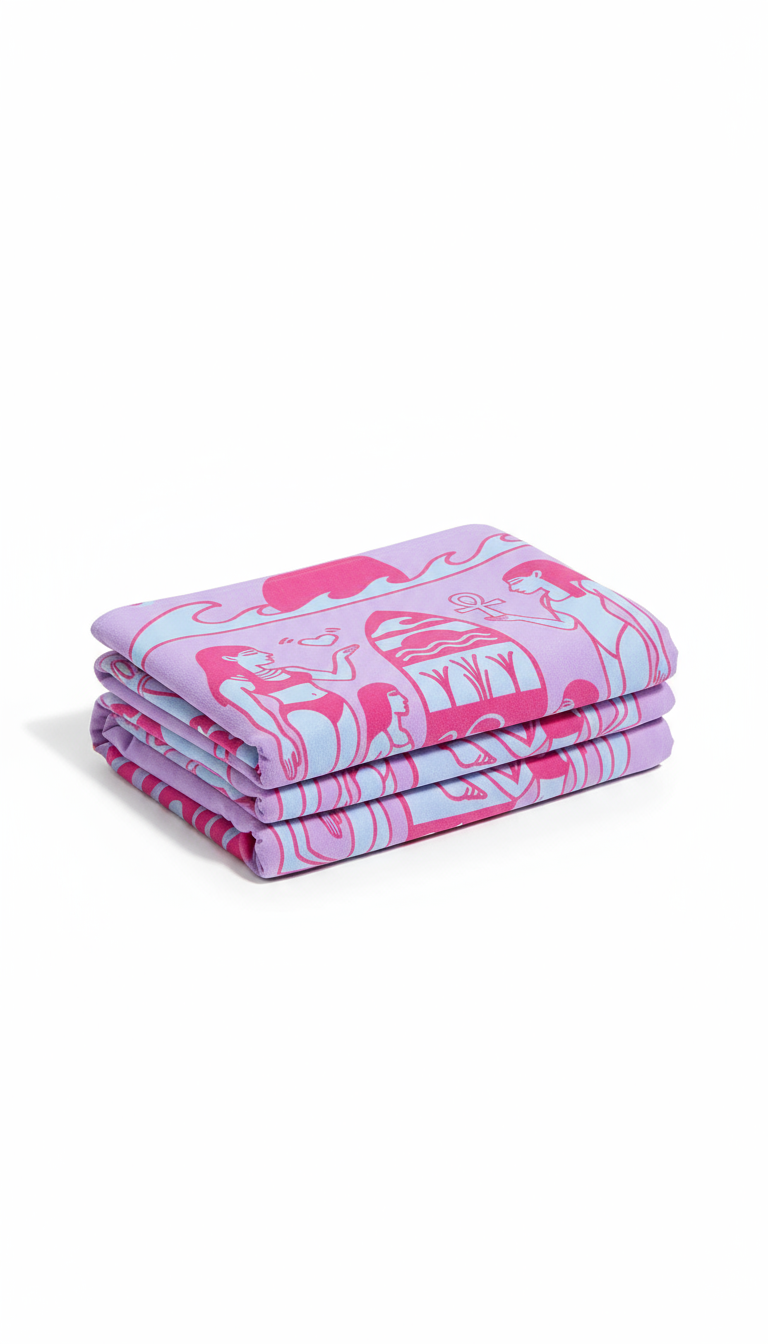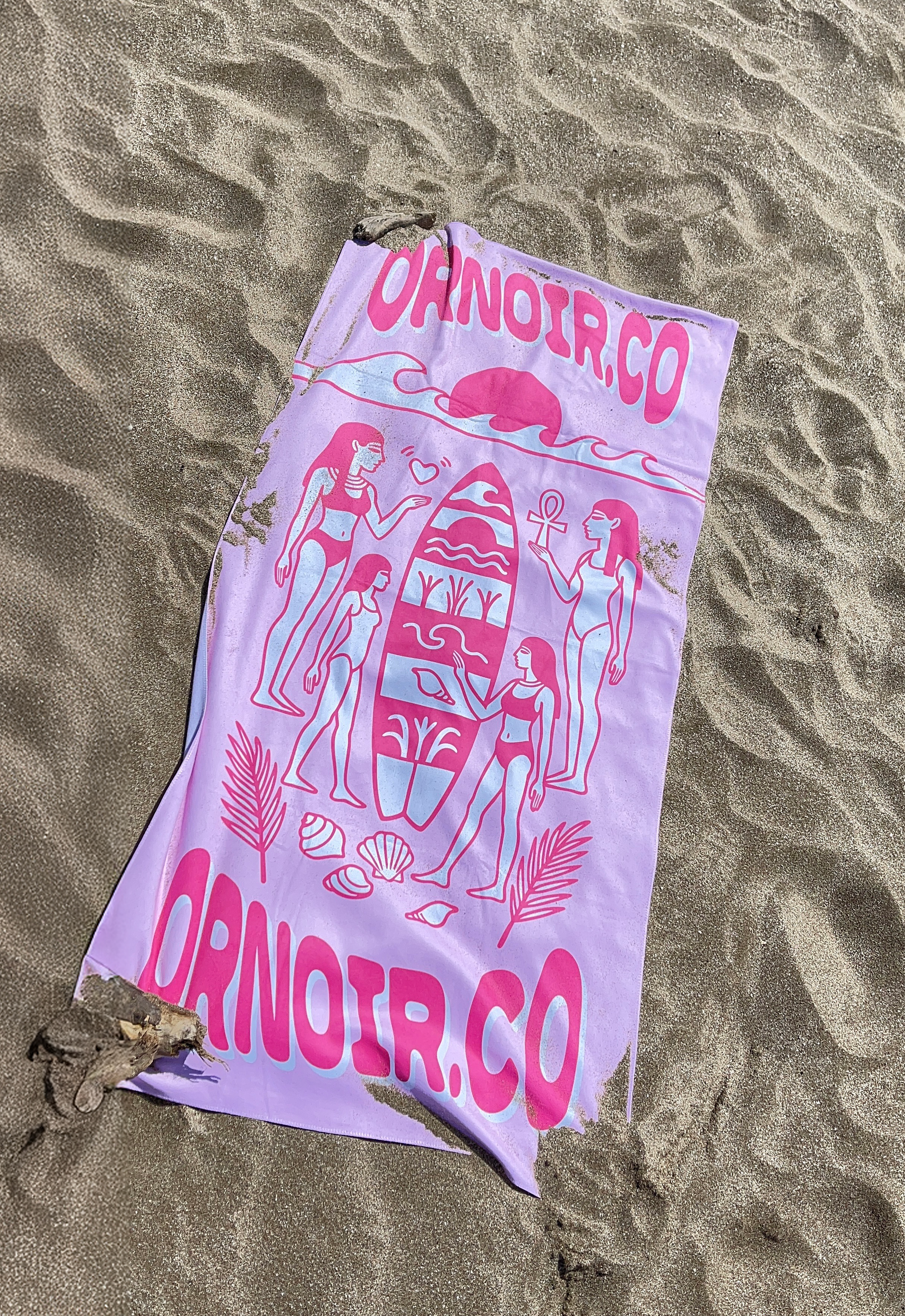This Ankh beach towel stands out with its unique design and vibrant colors, adding style to your beach experience. The light purple base complemented by hot pink graphics creates an energetic summer vibe.